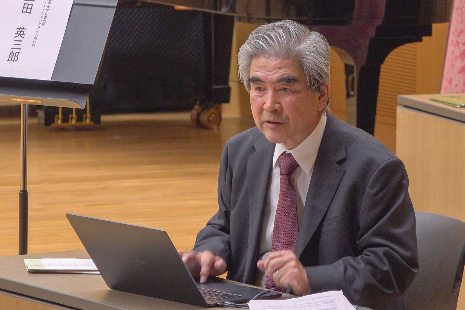 まずは梅本実学長による挨拶で国立音楽大学創立100周年記念プロジェクトの概要についてお話しがあり、つづいて附属図書館の館長である江澤聖子先生からは貴重資料についての概要の説明、登壇される先生方の紹介がありました。特に貴重資料は多くの方の協力によって整理と管理がされてきたことへの感謝、多くの演奏家や研究者にとってそれらが有益なものとなることを願っていることが強く語られました。
