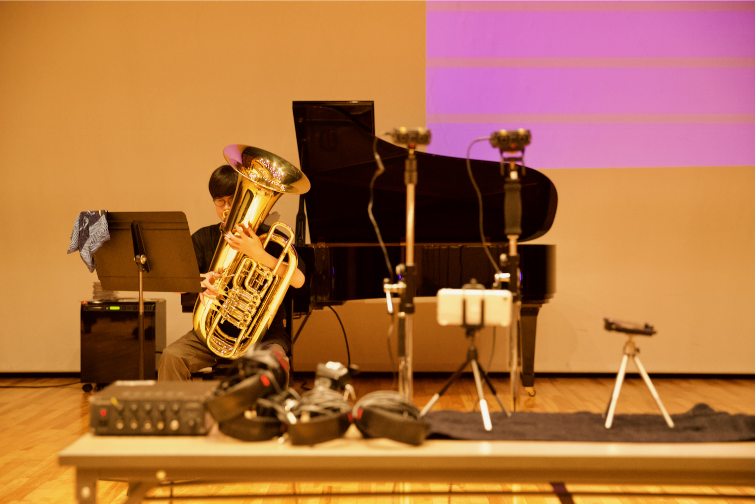 本学では定期的に、学生のための個人録音講座を開催しています。個人演奏の記録やコンクール、オーディションの音源審査に提出する際に、スマートフォンやポータブル録音機などを用いて可能な限り「良い音」で録音するため、学生たちが音響の基礎を学び、実践に結びつけています。